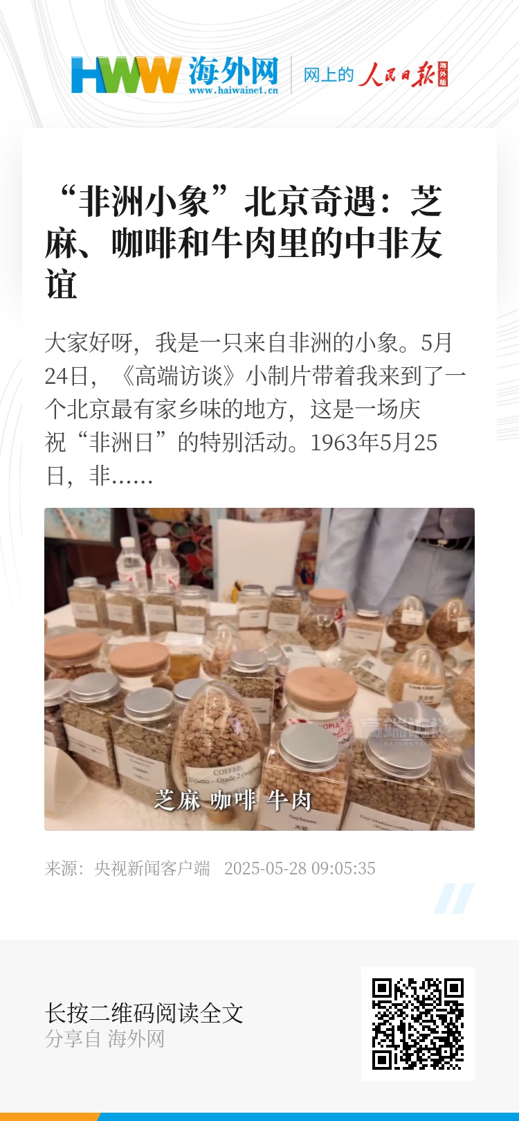 1963年5月25日,非洲统一组织也就是非盟的前身,在埃塞俄比亚首都亚的斯亚贝巴成立。这天标志着非洲国家摆脱殖民统治,迈向独立、团结与自强。此后,非洲人民每年都会庆祝这一天。除了感受节日氛围,我还邀请我的“老乡们”聊一聊,他们眼中什么元素可以象征中非友谊。