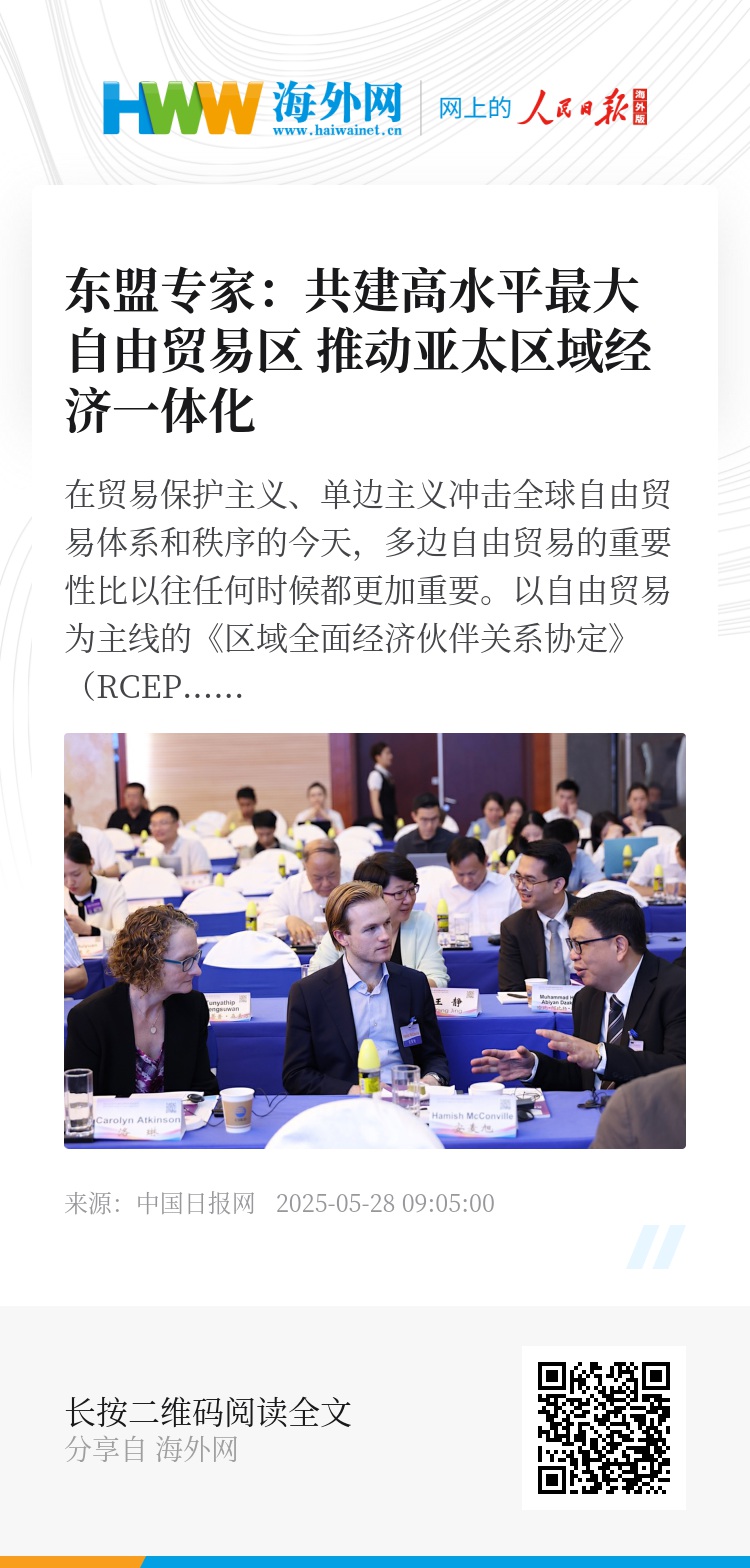 5月24—25日,由中国日报社、中国(海南)改革发展研究院、中国海洋发展基金会主办的“共建高水平最大自由贸易区——2025 RCEP区域发展媒体智库论坛”在海南省海口市举行。来自中国、日本、韩国、澳大利亚、文莱、柬埔寨、印度尼西亚、老挝、马来西亚、缅甸、菲律宾、新加坡、泰国、越南等14个国家的主流媒体、智库、企业负责人,以及来自东盟秘书处、中日韩合作秘书处、RCEP支持机构、世界自由区组织等国际组织的代表共约300人参加论坛,为区域合作增进共识、坚定信心、形成合力积极建言献策。