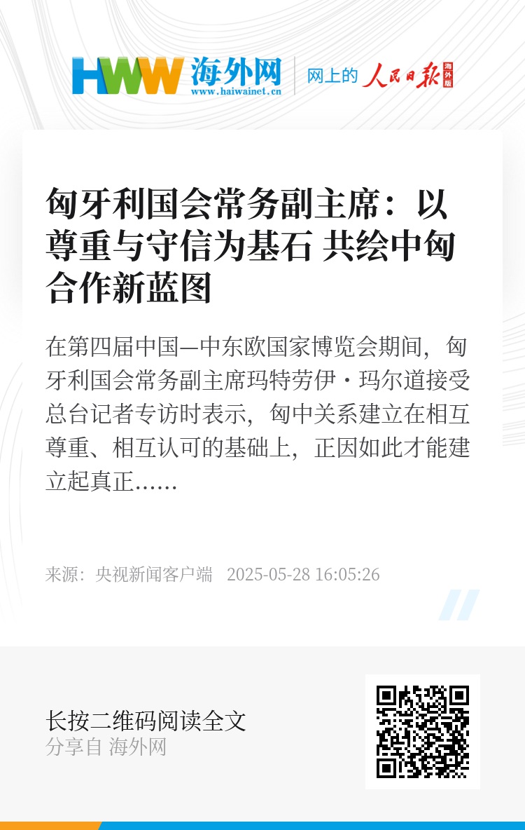 当被问及两国友好关系秘诀时,玛特劳伊・玛尔道表示,“相互尊重”与“守信”是核心。“我们始终强调,匈中关系建立在相互尊重、相互认可的基础上,尤其是我们坚持‘一个中国’原则,尊重对方的核心利益。正因为如此,我们之间才能建立起真正的友谊和伙伴关系。”她坚信,长期合作必将深化友谊,让双方未来可以继续相互信赖、彼此依靠。