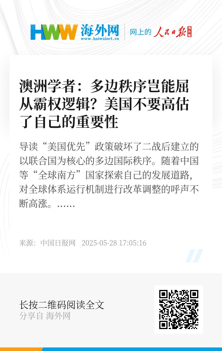 “美国优先”政策破坏了二战后建立的以联合国为核心的多边国际秩序。随着中国等“全球南方”国家探索自己的发展道路,对全球体系运行机制进行改革调整的呼声不断高涨。美国对此感到不安,并试图通过贸易战、退出国际机构等方式来维持霸权。然而,“全球南方”是未来经济增长的重要部分。面对美国单边施压,国际社会不应屈从于霸权,而要团结捍卫多边主义,回归真正以规则为基础的国际秩序。
