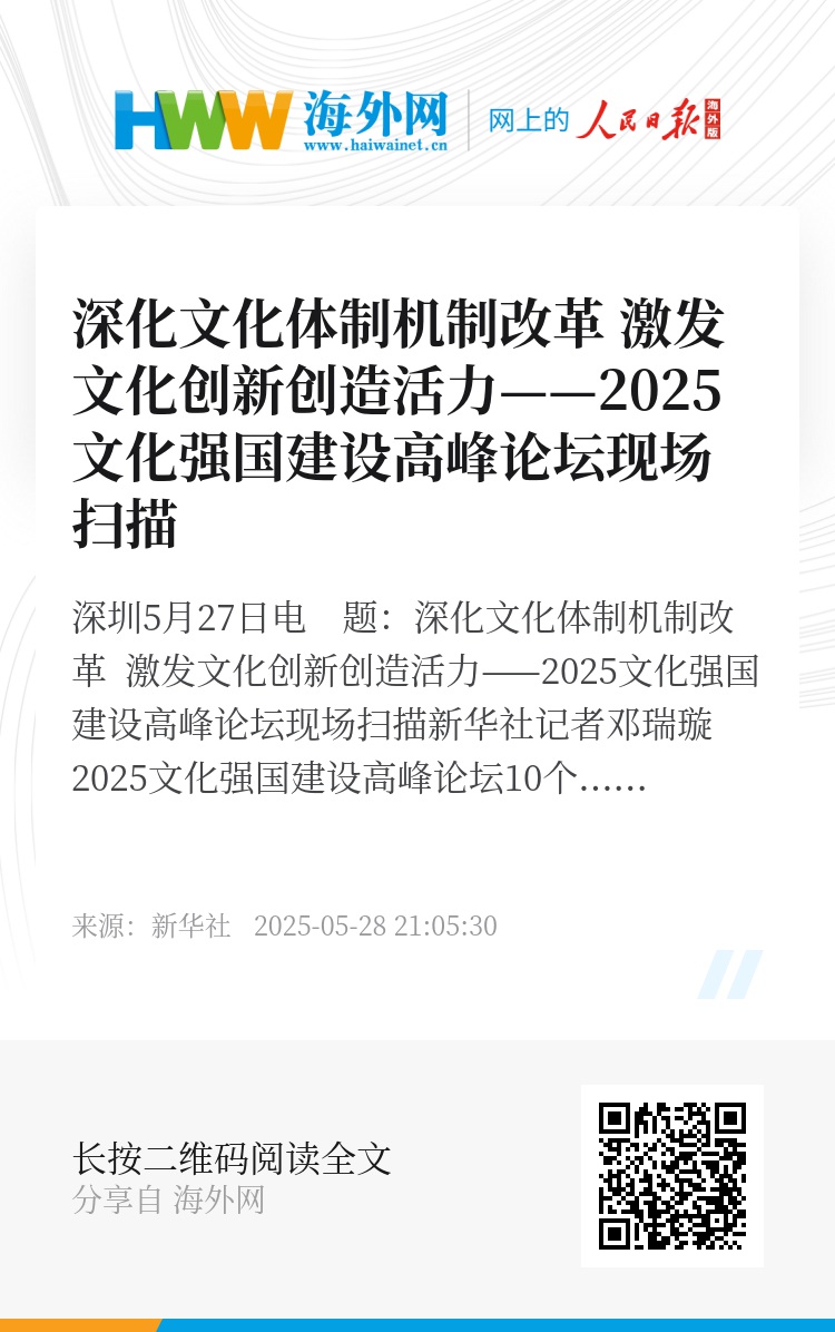 新华社深圳5月27日电 题:深化文化体制机制改革 激发文化创新创造活力——2025文化强国建设高峰论坛现场扫描