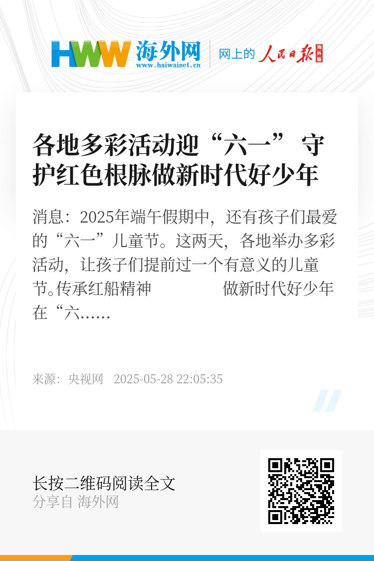 央视网消息:2025年端午假期中,还有孩子们最爱的“六一”儿童节。这两天,各地举办多彩活动,让孩子们提前过一个有意义的儿童节。