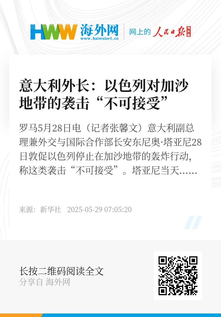 新华社罗马5月28日电(记者张馨文)意大利副总理兼外交与国际合作部长安东尼奥·塔亚尼28日敦促以色列停止在加沙地带的轰炸行动,称这类袭击“不可接受”。
