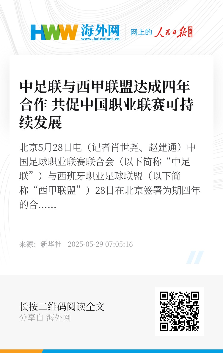 新华社北京5月28日电(记者肖世尧、赵建通)中国足球职业联赛联合会(以下简称“中足联”)与西班牙职业足球联盟(以下简称“西甲联盟”)28日在北京签署为期四年的合作备忘录,双方达成战略合作关系,未来将在职业联赛体系建设、青训体系优化等领域展开全方位的合作。