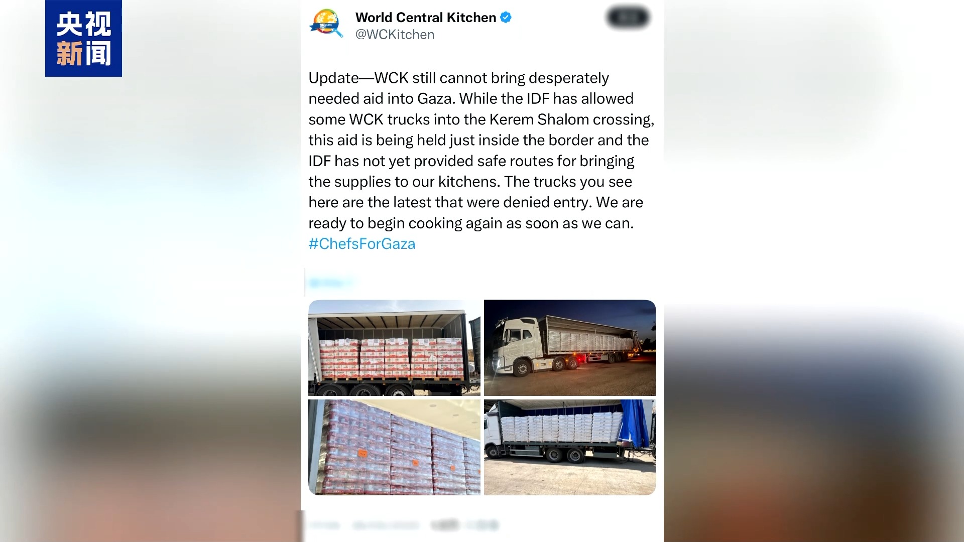 与此同时,慈善组织“世界中央厨房”27日发表消息称,该组织目前仍然无法将急需的援助物资运入加沙地带。虽然以军允许该组织一些运送援助物资的卡车进入凯雷姆沙洛姆口岸,但这些物资仍被扣留在边境地带,而且以军尚未提供将这些物资运进加沙地带的安全路线。