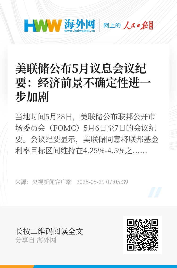 当地时间5月28日,美联储公布联邦公开市场委员会(FOMC)5月6日至7日的会议纪要。会议纪要显示,美联储同意将联邦基金利率目标区间维持在4.25%-4.5%之间。与会者一致认为,在考虑进一步调整联邦基金利率目标区间的幅度和时机时,委员会将仔细评估后续数据、不断变化的前景以及风险平衡。会议纪要称,在评估适当的货币政策立场时,委员会将继续监测未来信息对经济前景的影响。如果出现可能阻碍委员会目标实现的风险,他们将准备酌情调整货币政策立场。与会者称其评估将考虑广泛的信息,包括劳动力市场状况、通胀压力和通胀预期,以及金融和国际形势发展。