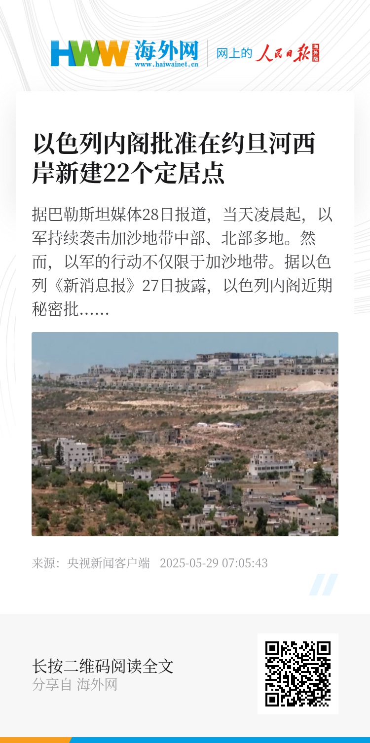 然而,以军的行动不仅限于加沙地带。据以色列《新消息报》27日披露,以色列内阁近期秘密批准了一项提案,在约旦河西岸建立22个新的定居点。