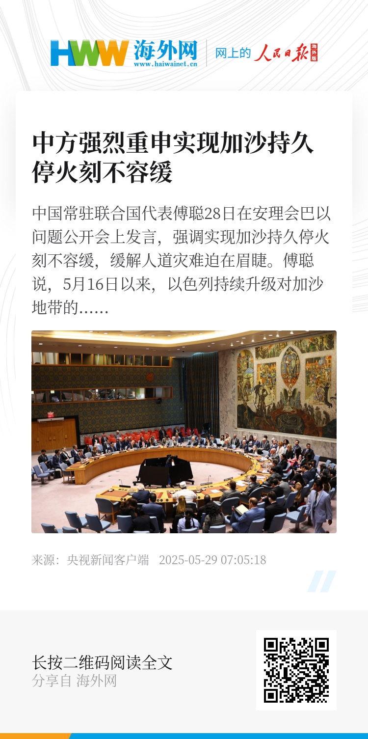 傅聪说,5月16日以来,以色列持续升级对加沙地带的军事进攻,大量人口稠密地区被夷为平地,仅过去2周就导致1000多名加沙民众死亡。安理会和联大通过多份决议要求立即停火,但冲突至今没有平息,战争的引擎仍在轰鸣。继续延长战事,不会使人质获释,只会导致更多的死亡和仇恨。