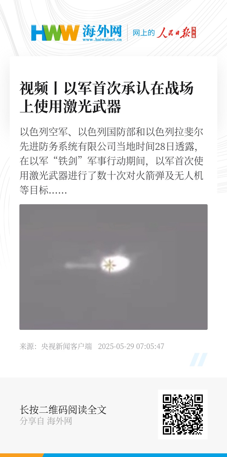 以色列空军、以色列国防部和以色列拉斐尔先进防务系统有限公司当地时间28日透露,在以军“铁剑”军事行动期间,以军首次使用激光武器进行了数十次对火箭弹及无人机等目标的拦截。这是该国首次承认在战场上使用这种定向能武器。