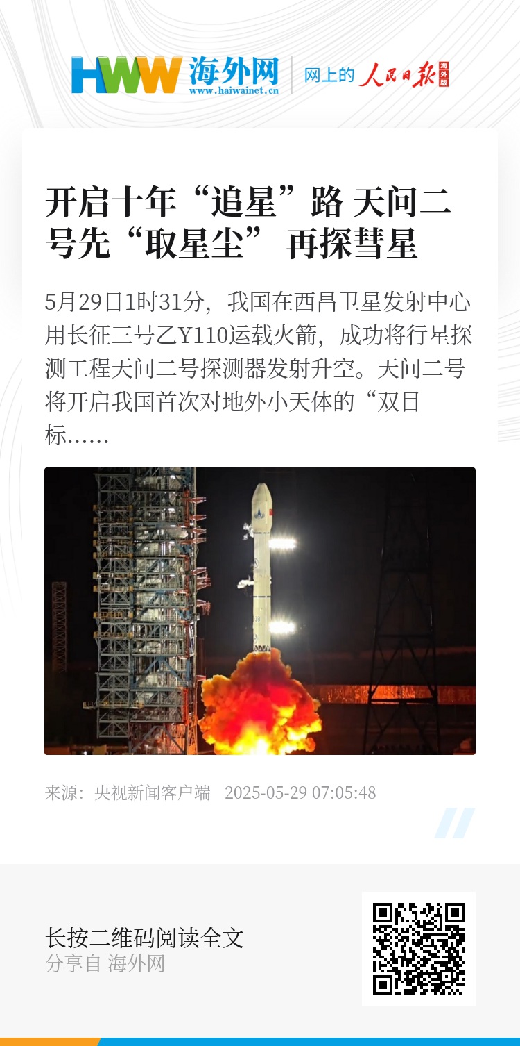 5月29日1时31分,我国在西昌卫星发射中心用长征三号乙Y110运载火箭,成功将行星探测工程天问二号探测器发射升空。