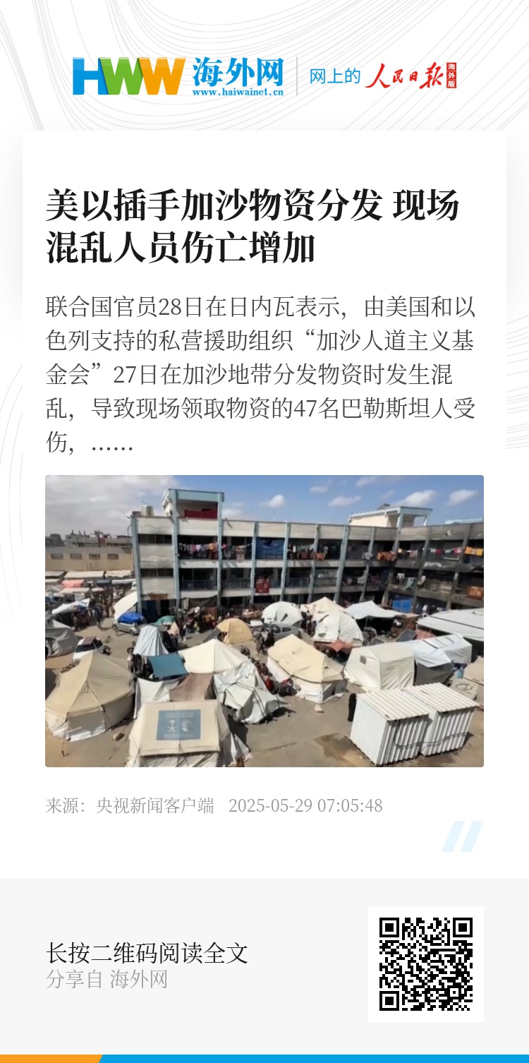 联合国官员28日在日内瓦表示,由美国和以色列支持的私营援助组织“加沙人道主义基金会”27日在加沙地带分发物资时发生混乱,导致现场领取物资的47名巴勒斯坦人受伤,其中大部分疑似是遭以军枪击所致。