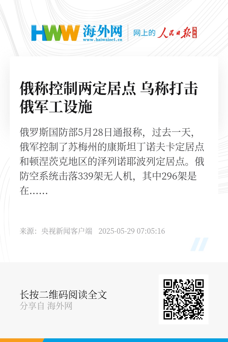 俄罗斯国防部5月28日通报称,过去一天,俄军控制了苏梅州的康斯坦丁诺夫卡定居点和顿涅茨克地区的泽列诺耶波列定居点。俄防空系统击落339架无人机,其中296架是在特别军事行动区域之外被击落的。
