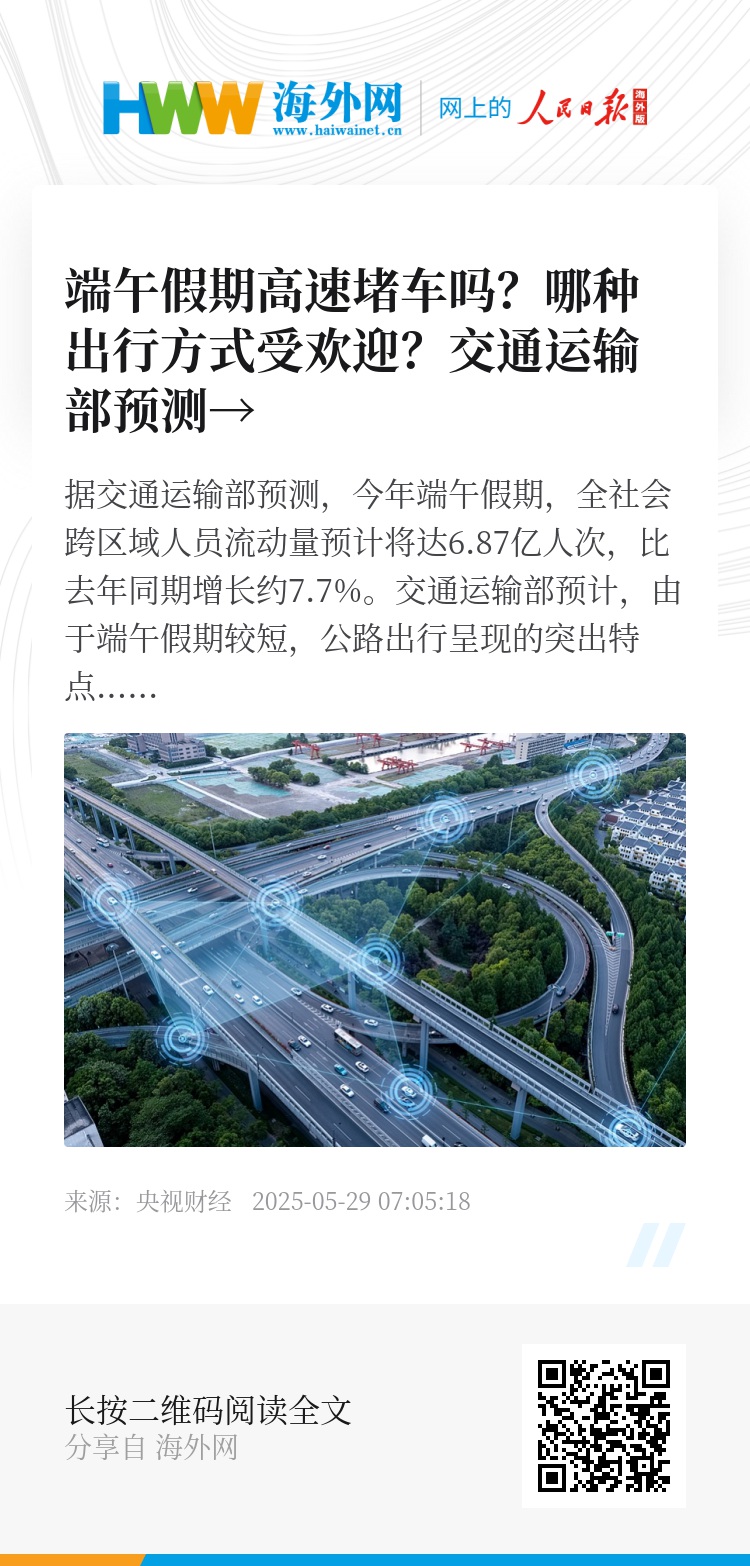 据交通运输部预测,今年端午假期,全社会跨区域人员流动量预计将达6.87亿人次,比去年同期增长约7.7%。