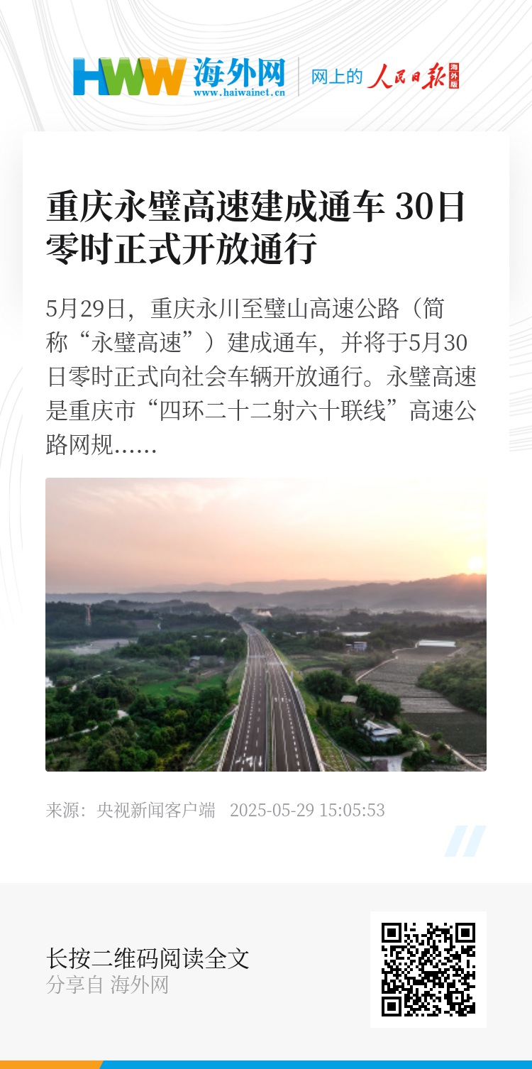 5月29日,重庆永川至璧山高速公路(简称“永璧高速”)建成通车,并将于5月30日零时正式向社会车辆开放通行。