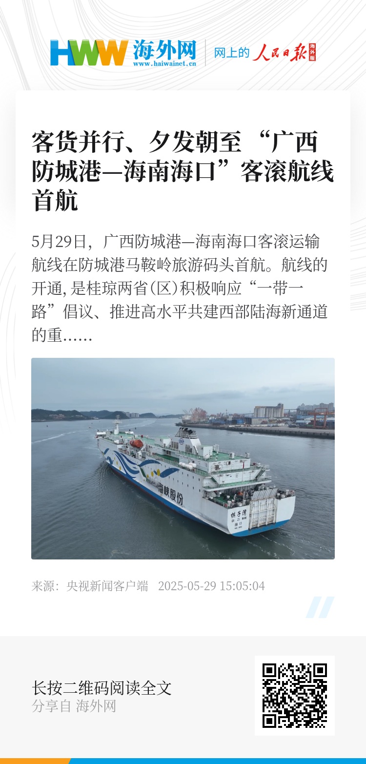 5月29日,广西防城港—海南海口客滚运输航线在防城港马鞍岭旅游码头首航。航线的开通,是桂琼两省(区)积极响应 “一带一路”倡议、推进高水平共建西部陆海新通道的重要实践,标志着北部湾国际门户港与海南自由贸易港两大国家级战略支点实现高效联通,为深化桂琼区域合作、促进区域经济协调发展搭建起全新战略通道。