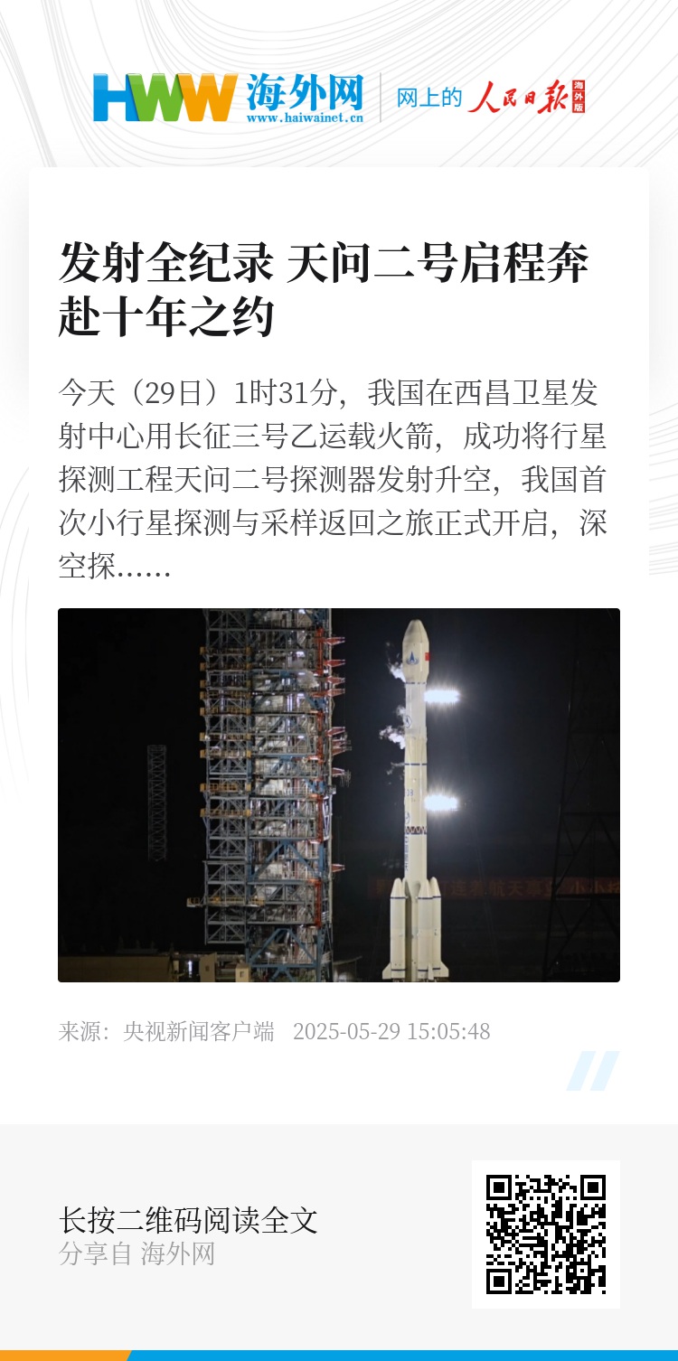 今天(29日)1时31分,我国在西昌卫星发射中心用长征三号乙运载火箭,成功将行星探测工程天问二号探测器发射升空,我国首次小行星探测与采样返回之旅正式开启,深空探测任务迈出新的一步。一起来看天问二号任务发射纪实。