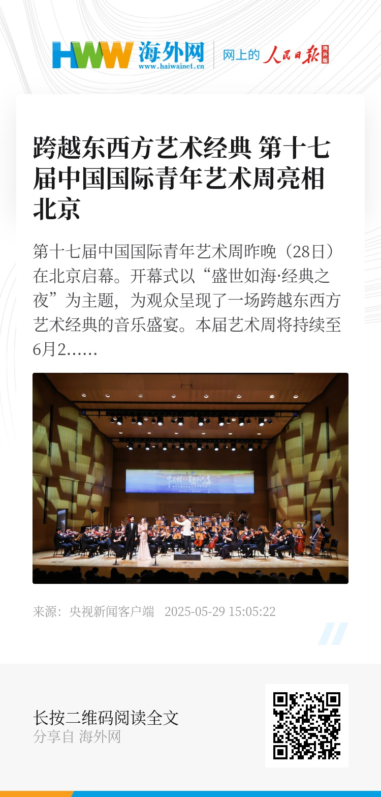 第十七届中国国际青年艺术周昨晚(28日)在北京启幕。开幕式以“盛世如海·经典之夜”为主题,为观众呈现了一场跨越东西方艺术经典的音乐盛宴。