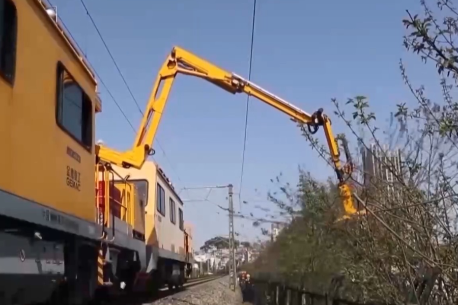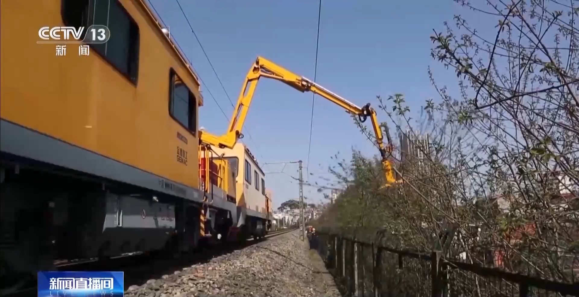 巡检中发现的危险树木,现在也有了智能机械手来砍伐,它还能清扫高空中的接触网配件,只要一名操作人员远程操控,比人工砍伐效率提升了5倍以上,还更安全。