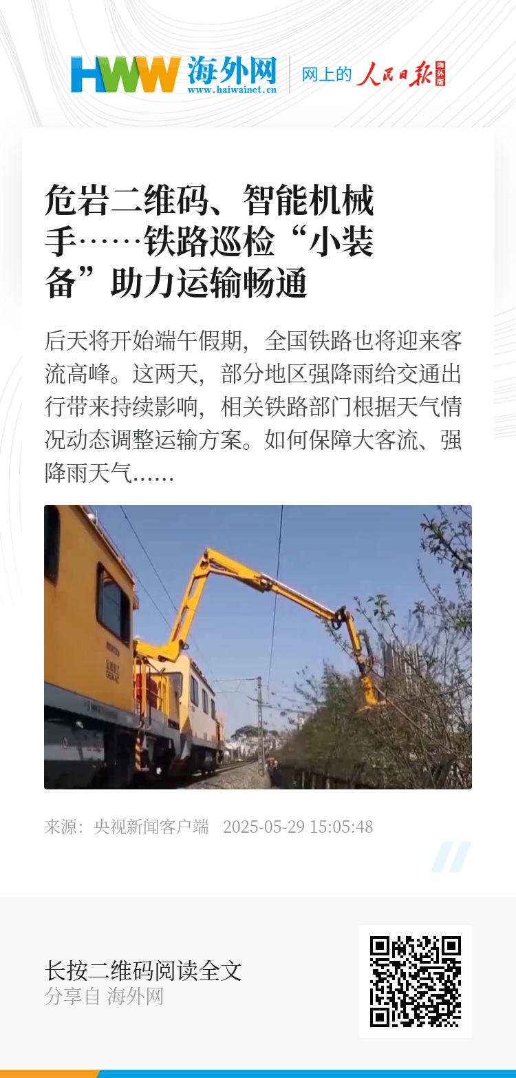 国铁武汉局襄阳工务段桥隧工 梁兆慈:这些二维码相当于我们给孤石、危岩、重点地段制作的专属“身份证”。用手机一扫,就能全方位了解应急抢险路线、风险隐患等级、检查注意事项等等。现在在二维码加无人机“人机互助、立体交叉”式检查下,铁路汛期安全更有保障。