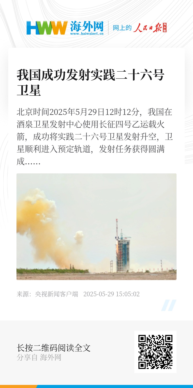 北京时间2025年5月29日12时12分,我国在酒泉卫星发射中心使用长征四号乙运载火箭,成功将实践二十六号卫星发射升空,卫星顺利进入预定轨道,发射任务获得圆满成功。该卫星主要用于国土普查、环境治理等领域,为国民经济建设提供信息服务。