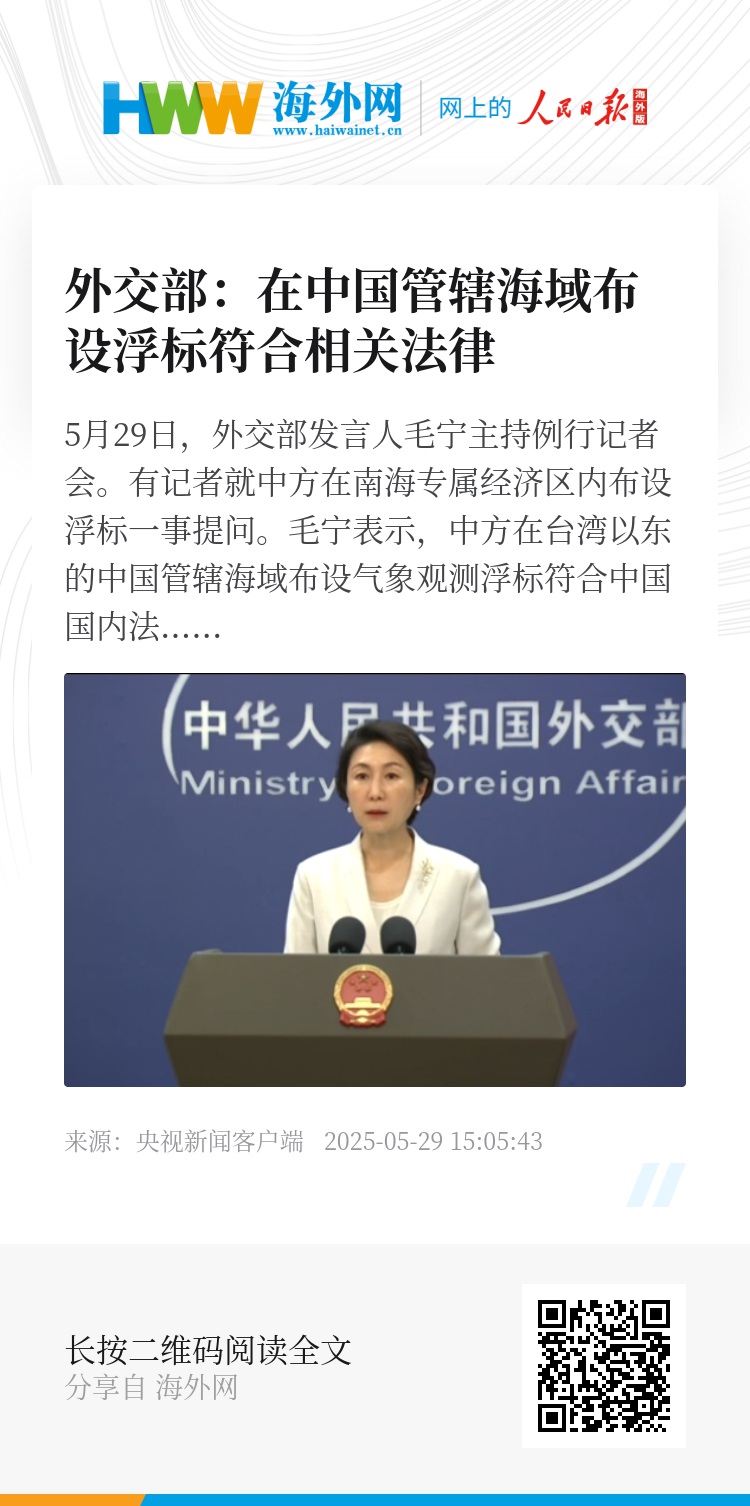 5月29日,外交部发言人毛宁主持例行记者会。有记者就中方在南海专属经济区内布设浮标一事提问。