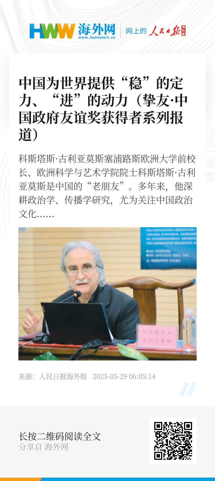 塞浦路斯欧洲大学前校长、欧洲科学与艺术学院院士科斯塔斯·古利亚莫斯是中国的“老朋友”。多年来,他深耕政治学、传播学研究,尤为关注中国政治文化与全球治理实践,并致力于推动中塞、中欧学术合作与对话。2024年,科斯塔斯·古利亚莫斯获颁中国政府友谊奖。