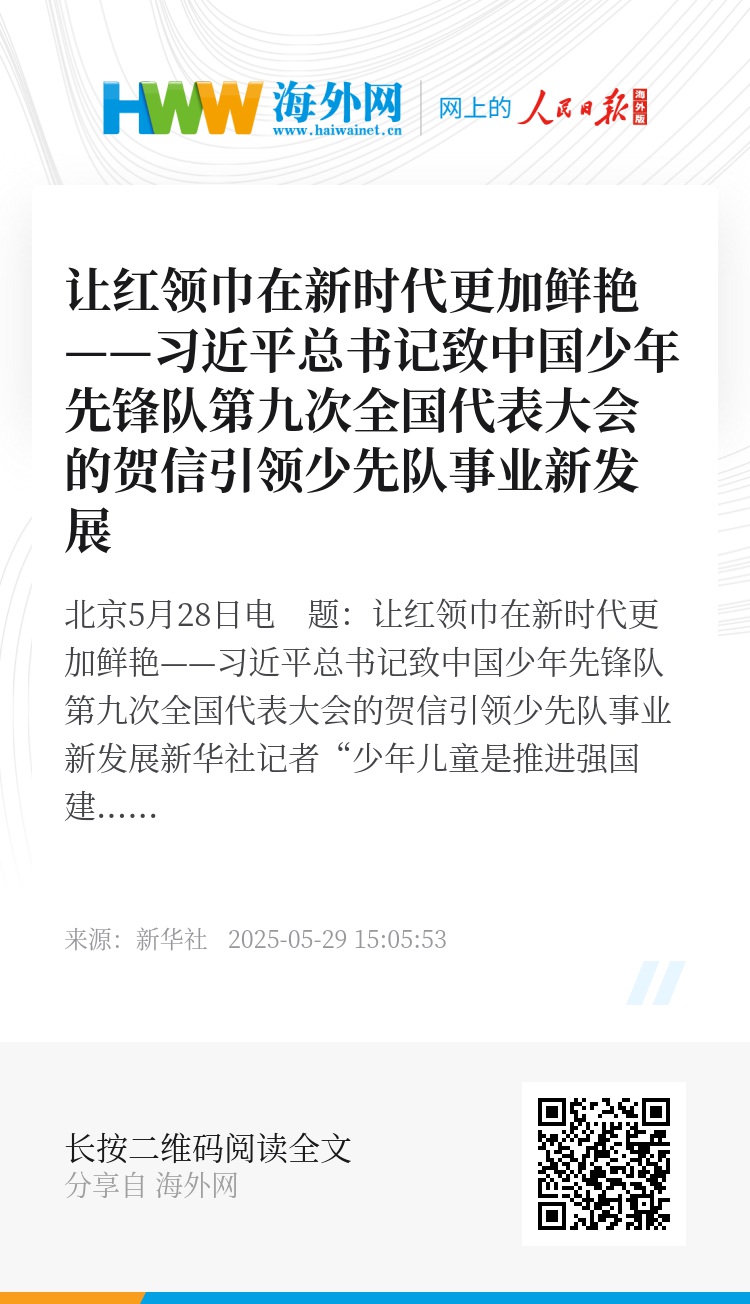 新华社北京5月28日电 题:让红领巾在新时代更加鲜艳——习近平总书记致中国少年先锋队第九次全国代表大会的贺信引领少先队事业新发展