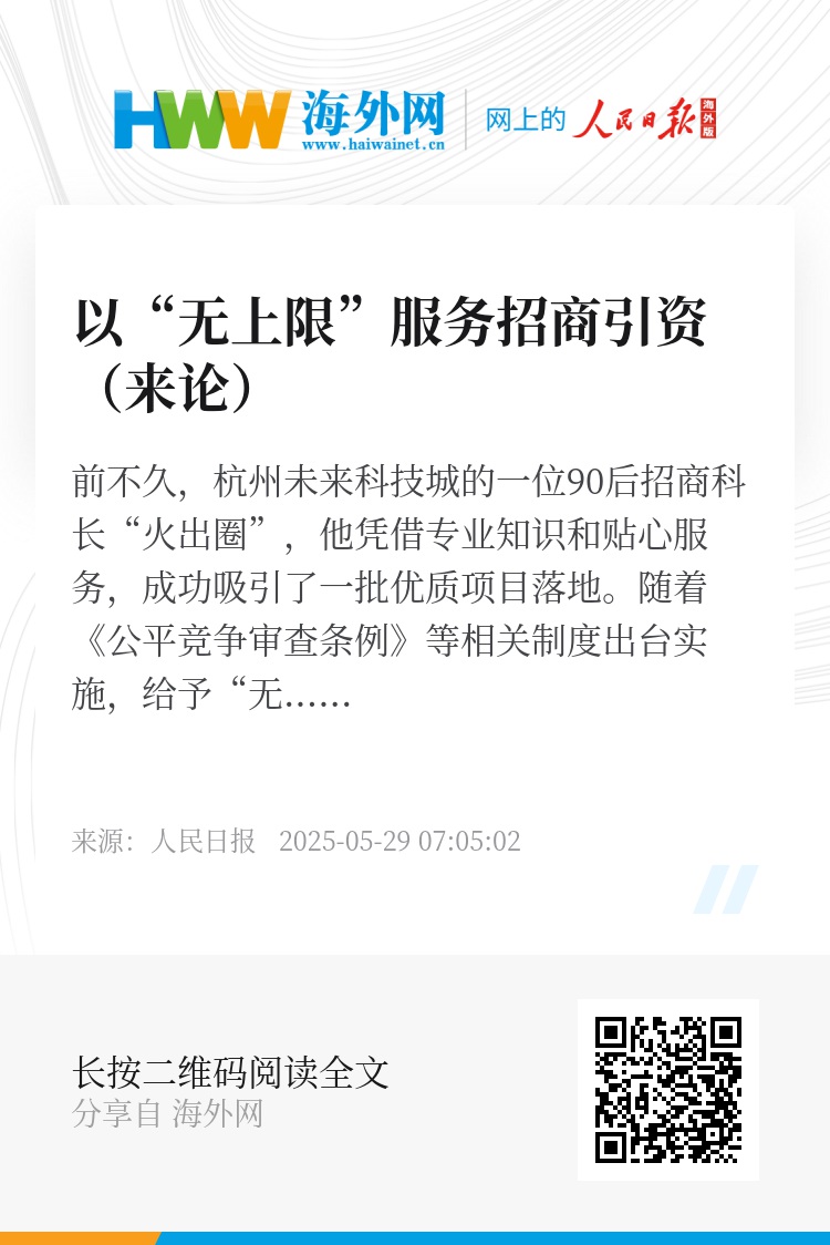 前不久,杭州未来科技城的一位90后招商科长“火出圈”,他凭借专业知识和贴心服务,成功吸引了一批优质项目落地。随着《公平竞争审查条例》等相关制度出台实施,给予“无底线”优惠的招商政策渐渐退出历史舞台,取而代之的是制度保障下的“无上限”服务。