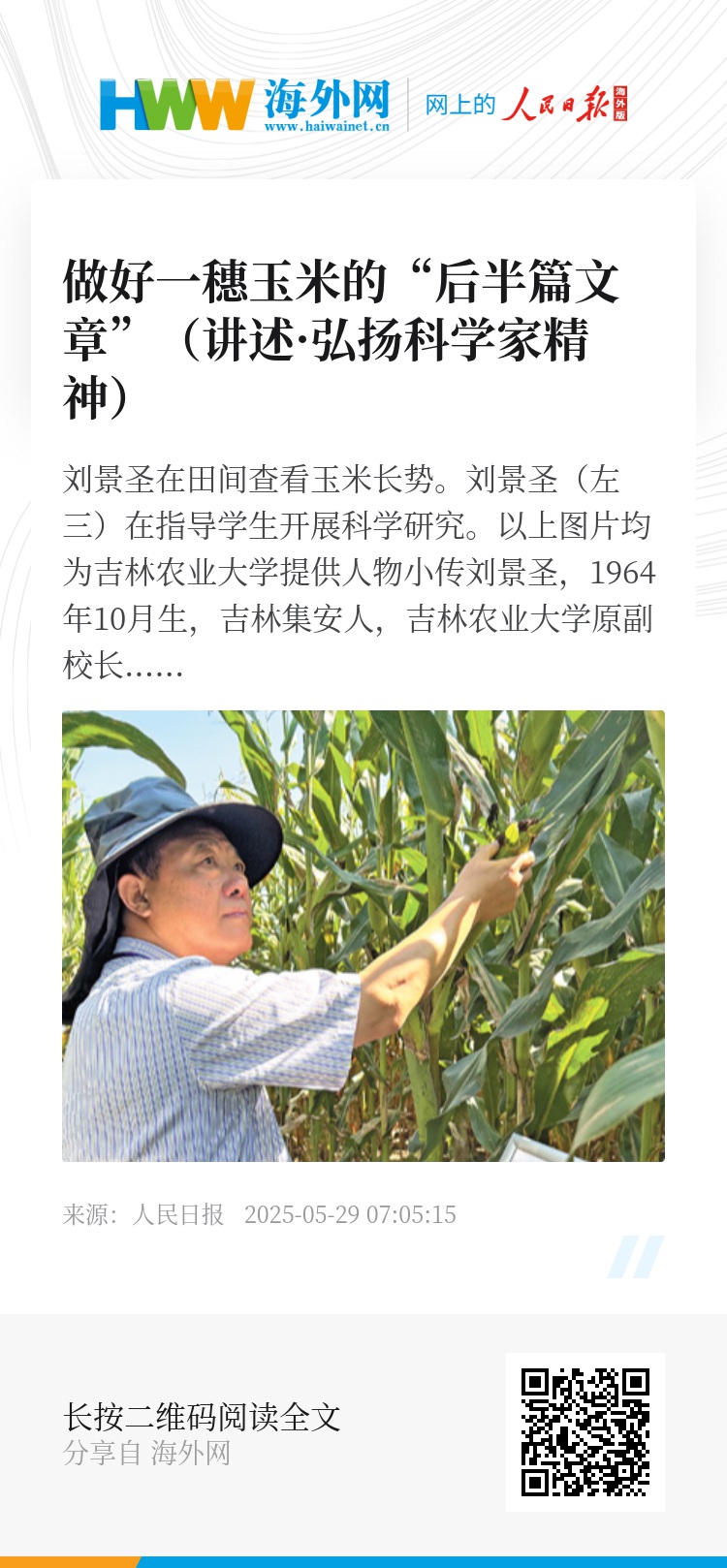 保质减损、鲜食玉米加工、玉米主食化……刘景圣的研究始终聚焦玉米采后的问题。“努力做好玉米的‘后半篇文章’,让好收成有好储存,让好玉米变好食品,让玉米发挥更大价值。”刘景圣这样形容自己的工作。