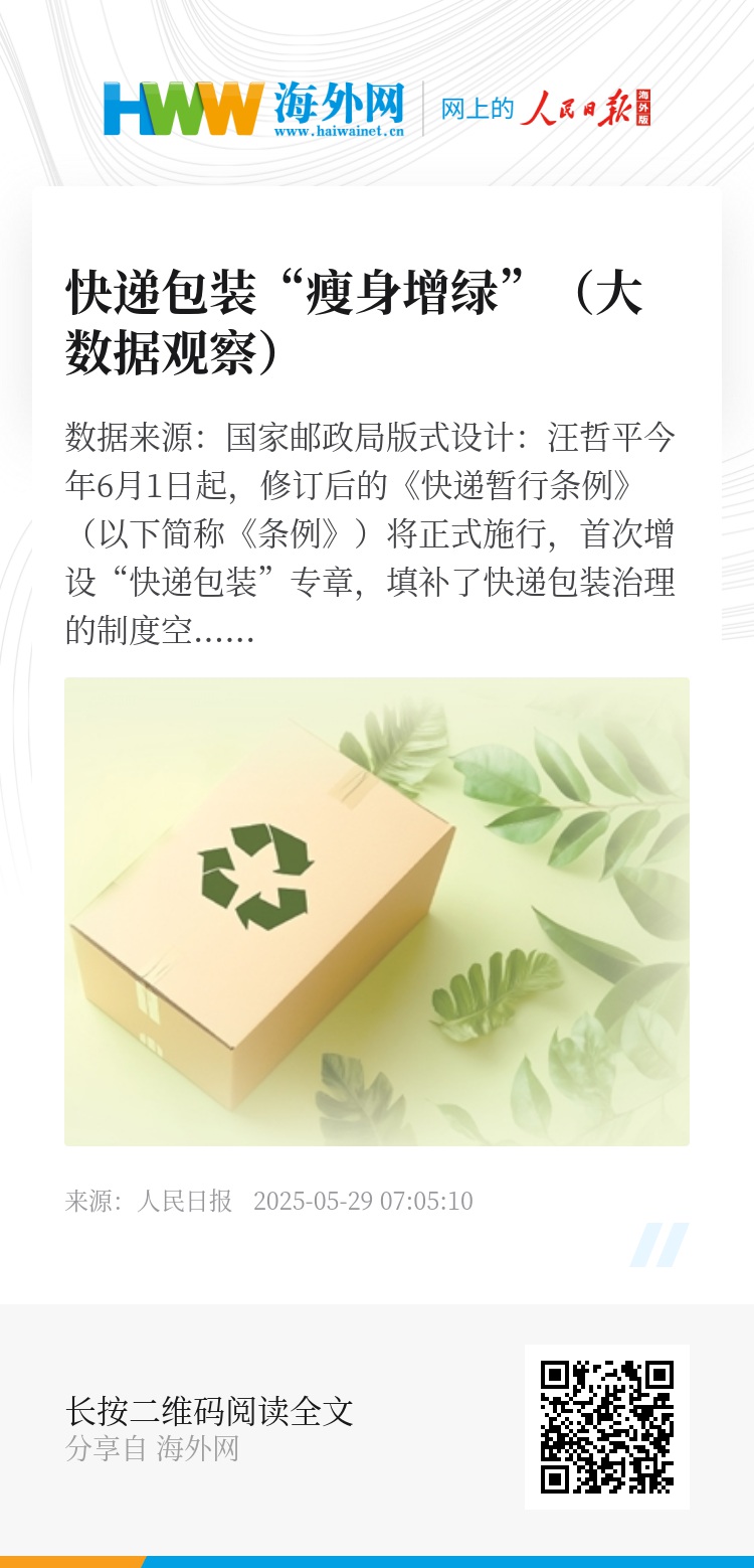 国家邮政局相关负责人介绍,截至去年底,电商快件不再二次包装比例超过95%,智能装箱技术让包装耗材减量达到20%,中转环节循环包装实现全覆盖。