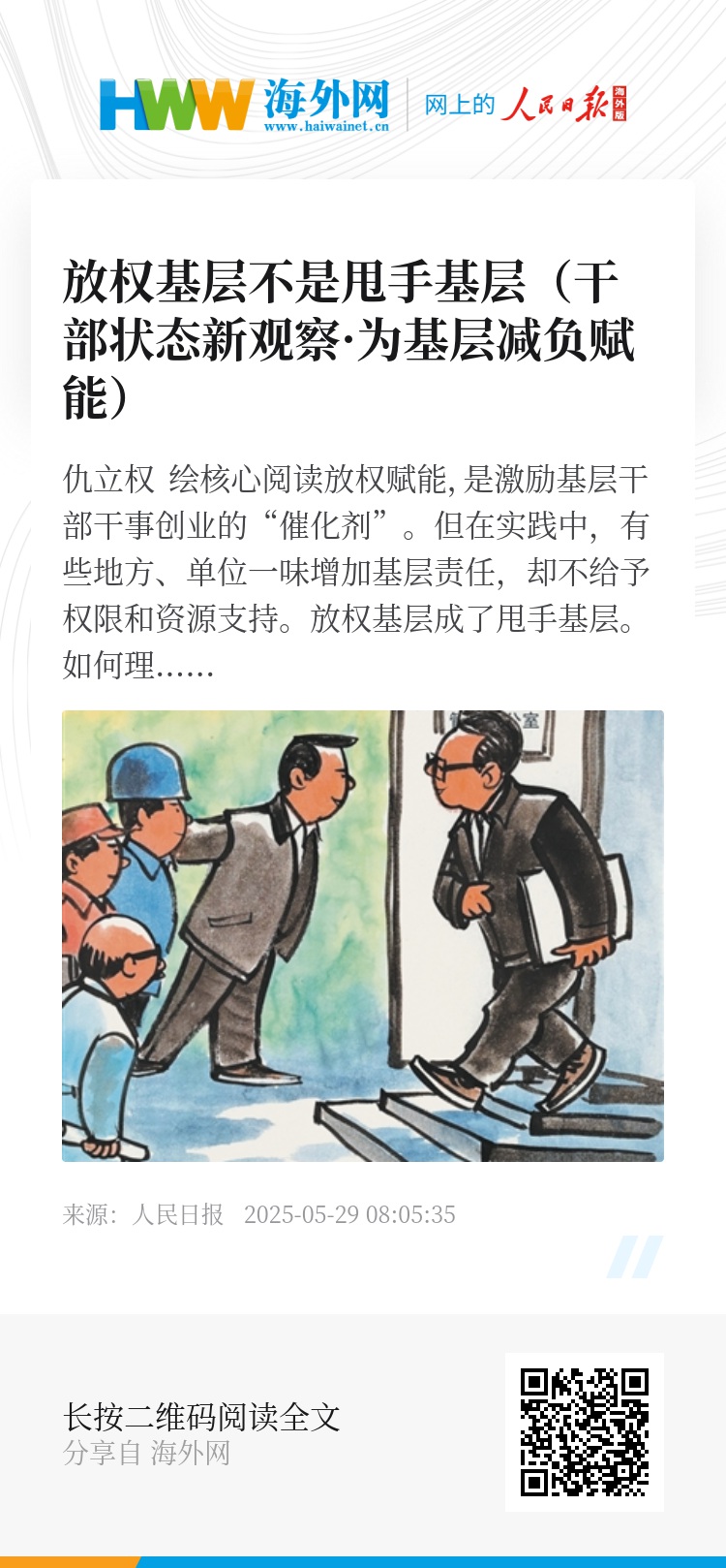 放权赋能,是激励基层干部干事创业的“催化剂”。但在实践中,有些地方、单位一味增加基层责任,却不给予权限和资源支持。放权基层成了甩手基层。