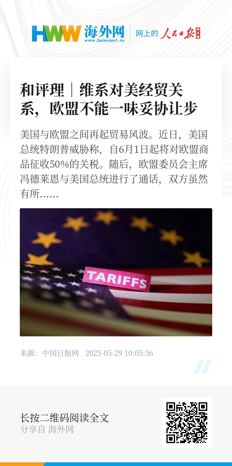美国与欧盟之间再起贸易风波。近日,美国总统特朗普威胁称,自6月1日起将对欧盟商品征收50%的关税。随后,欧盟委员会主席冯德莱恩与美国总统进行了通话,双方虽然有所缓和,但欧美关系走向仍面临诸多不确定性。