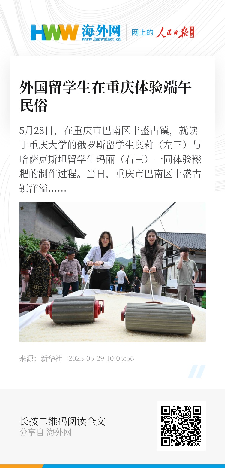 当日,重庆市巴南区丰盛古镇洋溢着浓浓的节日氛围,“粽情端午·幸福邻里”活动在此拉开帷幕。200余名古镇居民与来自重庆大学的俄罗斯、哈萨克斯坦留学生欢聚一堂,打糍粑、做香囊、品粽子、划旱龙舟,共同体验传统端午习俗。