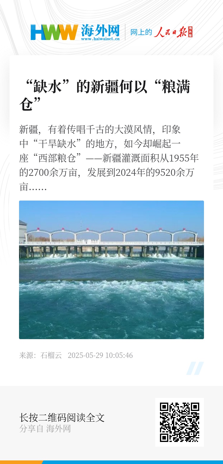 新疆,有着传唱千古的大漠风情,印象中“干旱缺水”的地方,如今却崛起一座“西部粮仓”——新疆灌溉面积从1955年的2700余万亩,发展到2024年的9520余万亩,粮食亩产从1955年的不足一百公斤,到2024年粮食平均亩产、播种面积增量双双跃居全国第一。