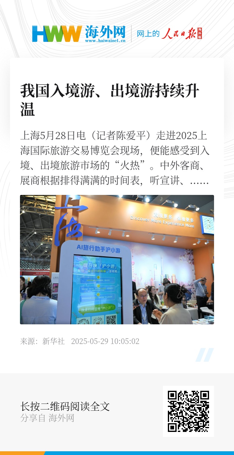 新华社上海5月28日电(记者陈爱平)走进2025上海国际旅游交易博览会现场,便能感受到入境、出境旅游市场的“火热”。中外客商、展商根据排得满满的时间表,听宣讲、看项目、谈合作。入出境游的“双向奔赴”,正为世界旅游市场注入动力。