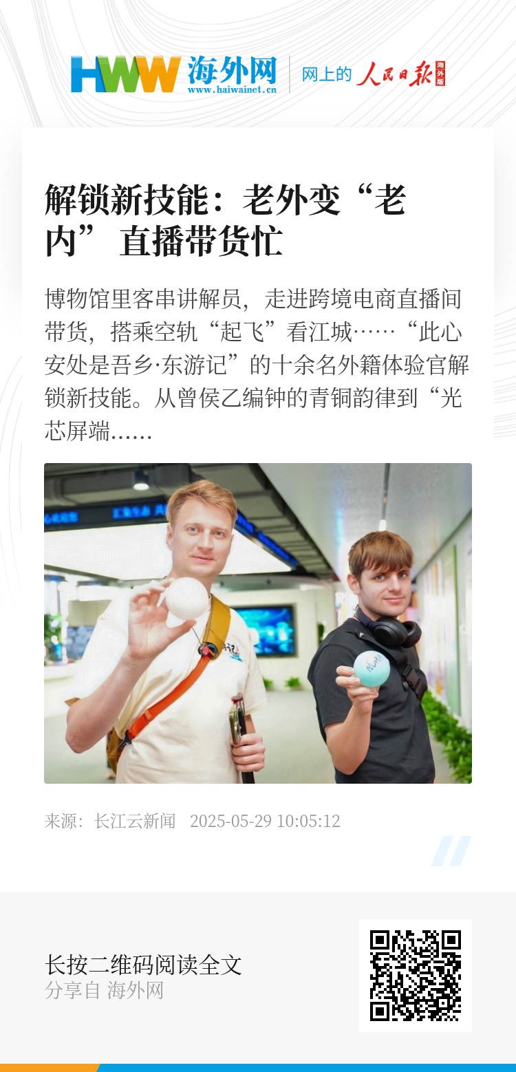 博物馆里客串讲解员,走进跨境电商直播间带货,搭乘空轨“起飞”看江城……“此心安处是吾乡·东游记”的十余名外籍体验官解锁新技能。从曾侯乙编钟的青铜韵律到“光芯屏端网”的产业脉搏,从知音文化的传承到跨境电商“卖全球”速度,他们以第一视角见证荆楚大地生生不息的发展活力。