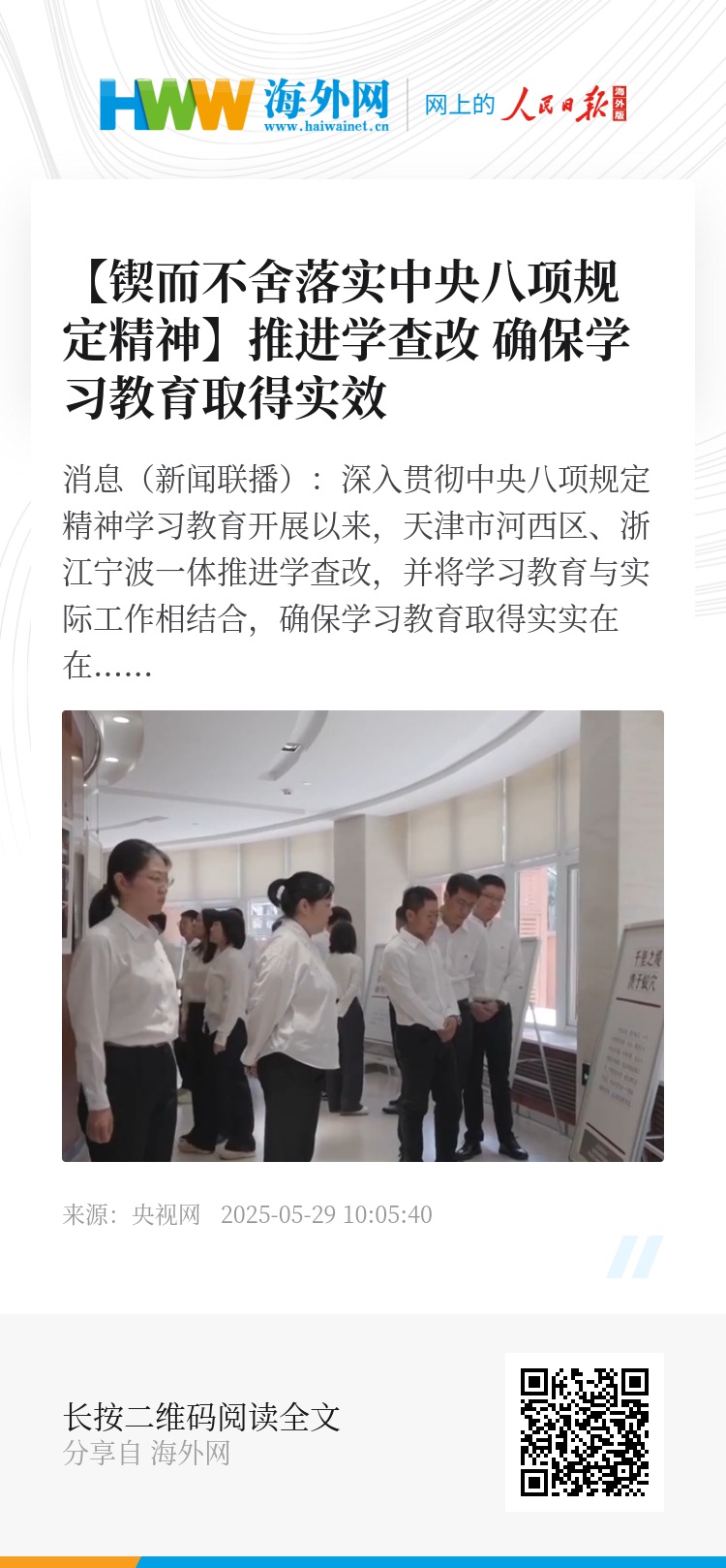 央视网消息(新闻联播):深入贯彻中央八项规定精神学习教育开展以来,天津市河西区、浙江宁波一体推进学查改,并将学习教育与实际工作相结合,确保学习教育取得实实在在的成效。