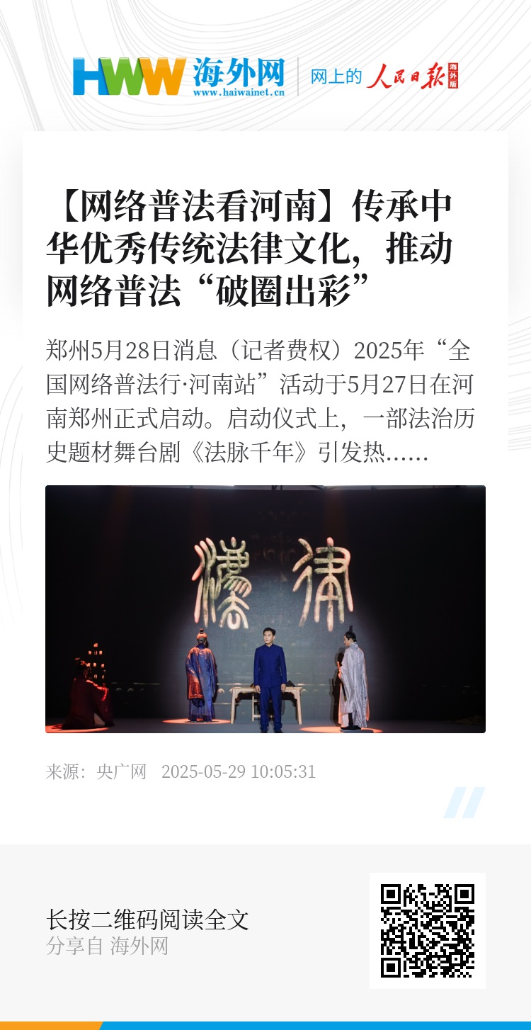 央广网郑州5月28日消息(记者费权)2025年“全国网络普法行·河南站”活动于5月27日在河南郑州正式启动。启动仪式上,一部法治历史题材舞台剧《法脉千年》引发热烈反响。
