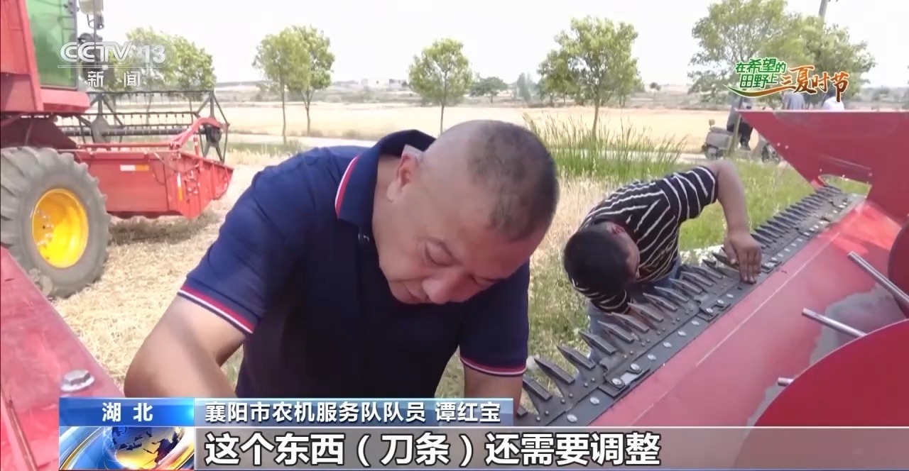 农机维修也是夏收中非常重要的一个环节。在湖北省襄阳市襄州区黄龙镇潘明村的1000亩大田里,6台收割机正赶在雨前抢收。突然,一台收割机出现故障止步不前,机手拨打维修电话20分钟后,农机服务车赶到了麦田旁。经过检修发现,这台收割机刀条发生了断裂。