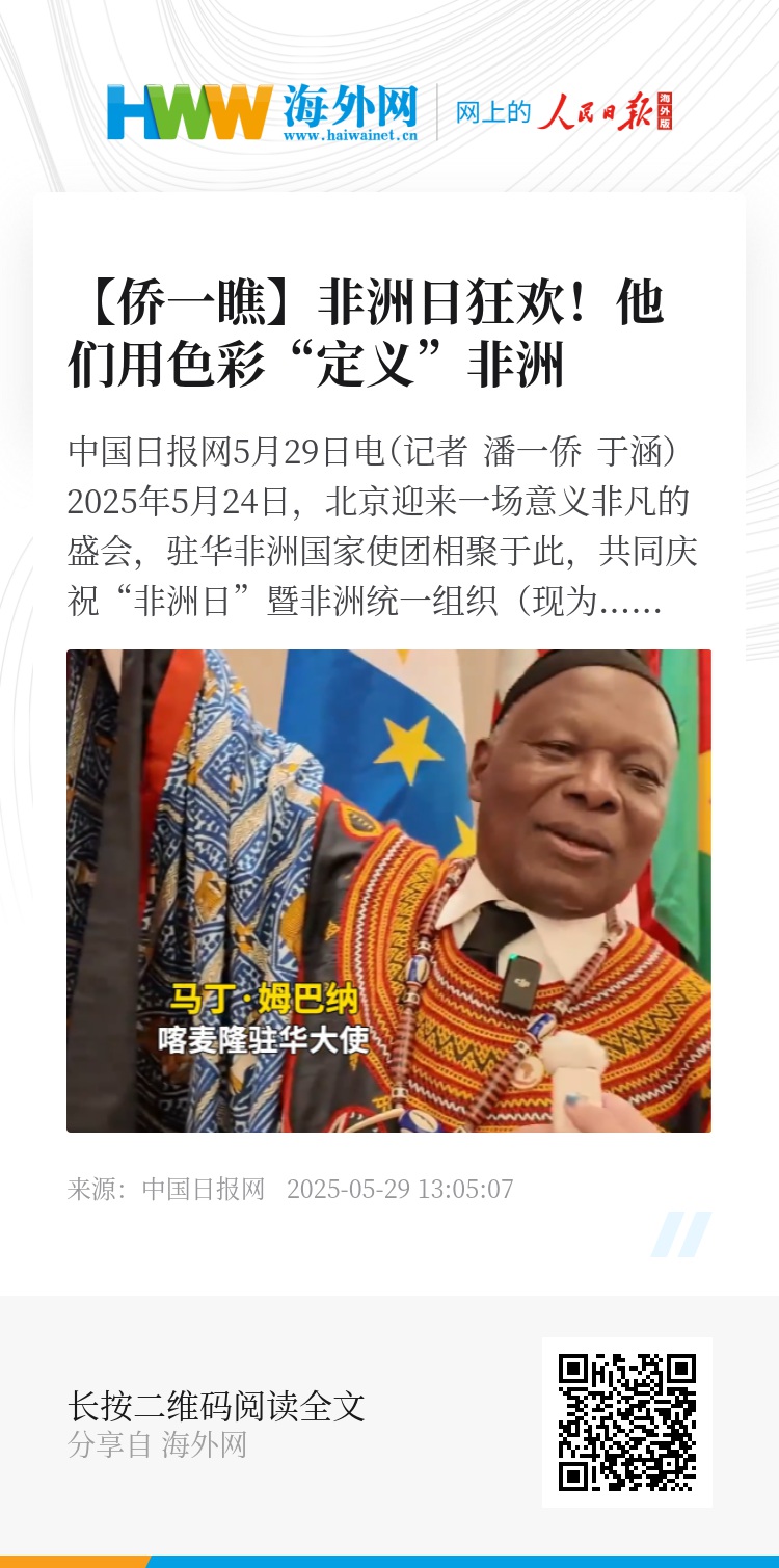 中国日报网5月29日电(记者 潘一侨 于涵) 2025年5月24日,北京迎来一场意义非凡的盛会,驻华非洲国家使团相聚于此,共同庆祝“非洲日”暨非洲统一组织(现为非洲联盟)成立62周年。这场庆典不仅是一次历史的纪念,更是一场多元文化的交流与融合,展现了非洲大陆的多彩魅力与深厚底蕴。