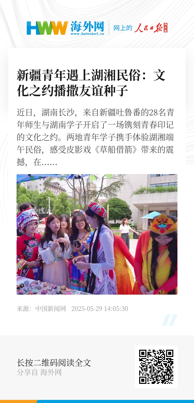 近日,湖南长沙,来自新疆吐鲁番的28名青年师生与湖南学子开启了一场镌刻青春印记的文化之约。两地青年学子携手体验湖湘端午民俗,感受皮影戏《草船借箭》带来的震撼,在漆扇上挥毫,书写“丝路相连”“石榴花开”等墨宝,学习制作香囊互赠祝福,播撒友谊的种子。(黎婕 钟河文 制作 徐妙巧)