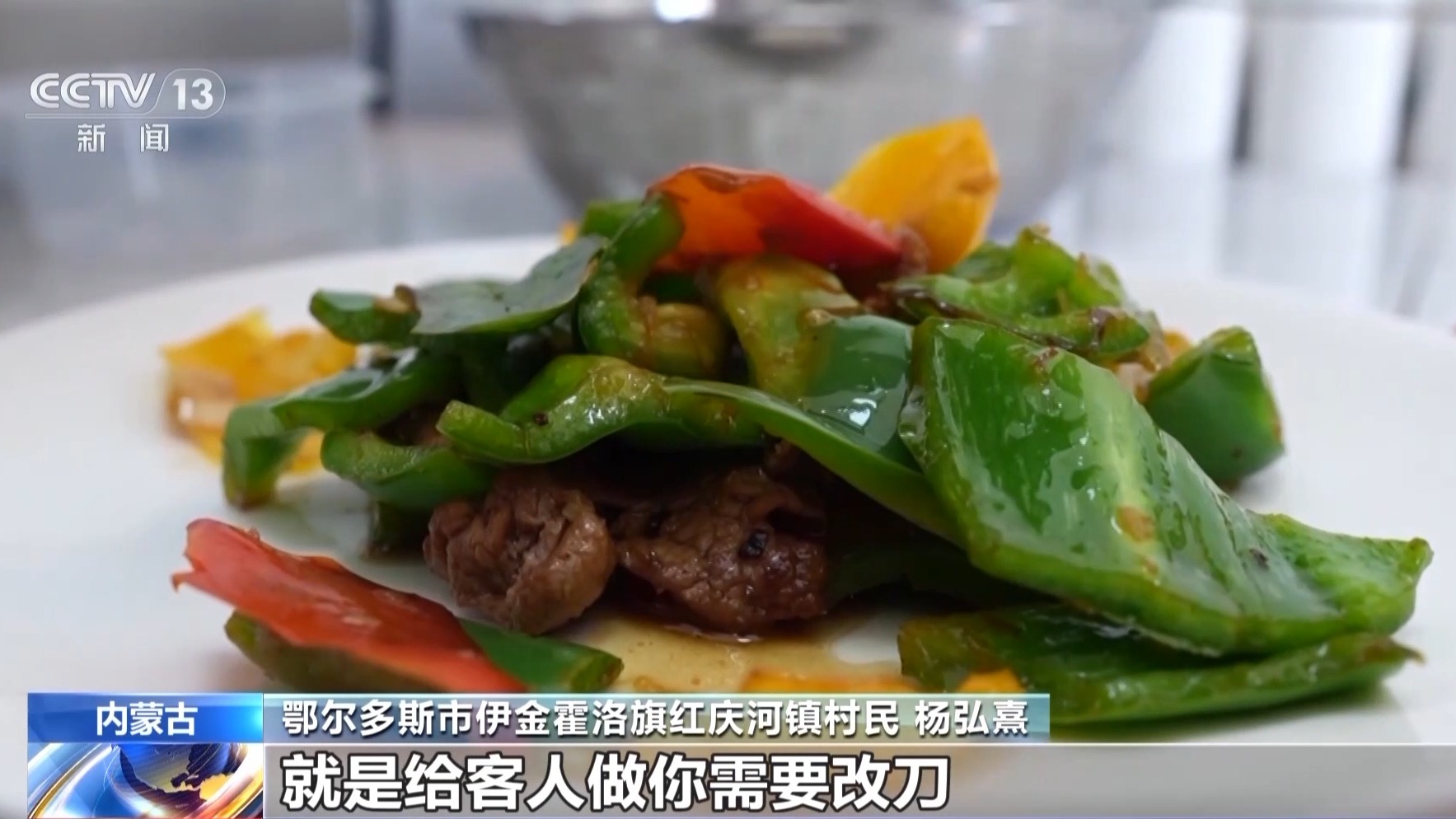 内蒙古鄂尔多斯市伊金霍洛旗红庆河镇村民 杨弘熹:家庭做是一种做法,在饭店给客人做又是一种做法,给客人做你需要改刀,又做得漂亮,还要做得色香味俱全。