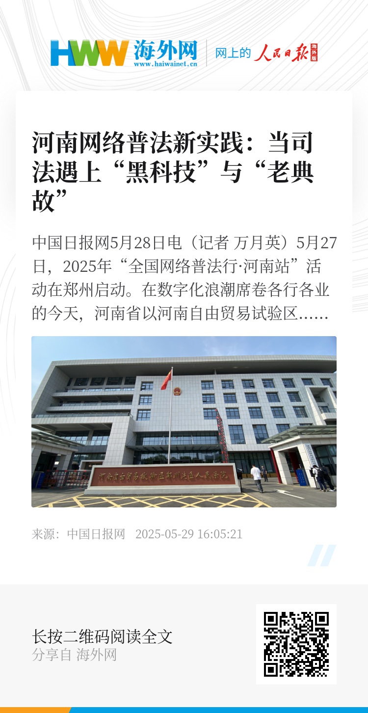 中国日报网5月28日电(记者 万月英)5月27日,2025年“全国网络普法行·河南站”活动在郑州启动。在数字化浪潮席卷各行各业的今天,河南省以河南自由贸易试验区郑州片区人民法院(以下简称“郑州自贸区法院”)为试验田,正探索一条“技术赋能+文化浸润”的网络普法新路径。从AI生成普法短剧到以列子寓言打造的诉讼文化街;从“一键生成诉状”到“云端法律夜读”,司法服务不再局限于庄严肃穆的法庭,而是以更亲民的姿态融入百姓生活,让法律知识在创新表达中“活”起来,真正“飞入寻常百姓家”。