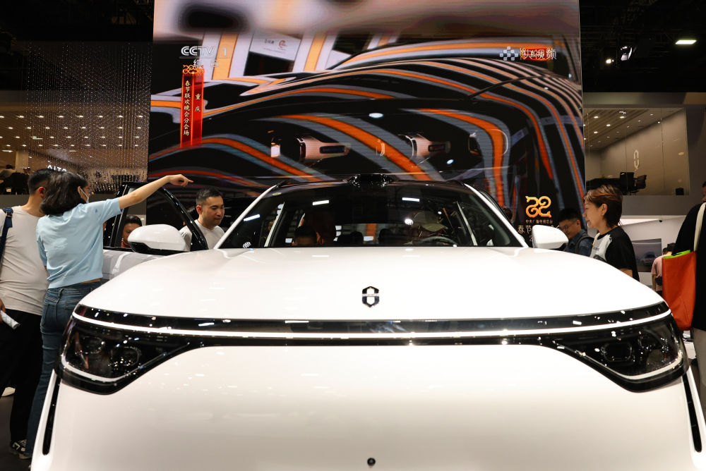 5月1日,参观者在第二十一届上海国际汽车工业展览会上的一辆问界M8展车旁交流。新华社记者 方喆 摄