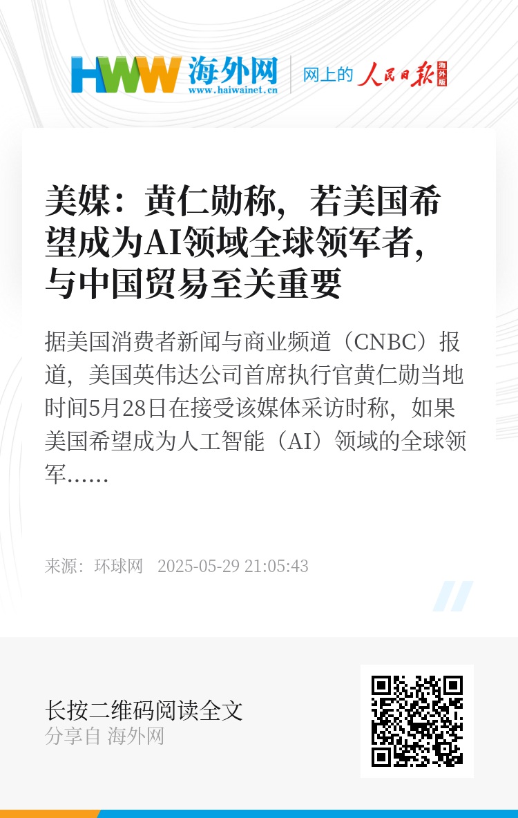 据美国消费者新闻与商业频道(CNBC)报道,美国英伟达公司首席执行官黄仁勋当地时间5月28日在接受该媒体采访时称,如果美国希望成为人工智能(AI)领域的全球领军者,与中国的贸易至关重要。