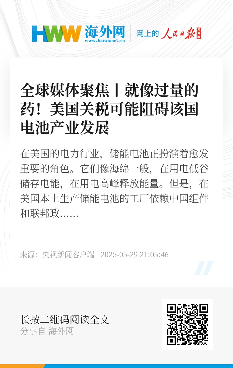 报道称,美国对华关税已经导致美国电池成本急剧上升。4月开始,美国对中国储能电池的关税在长达一个月的时间里超过150%,导致美国公司不得不暂停从中国进口电池。而如果缺乏这样的储能电池,美国的公用事业公司会被迫在昂贵的发电站和输电线路上投入更多的资金,以便满足炎热夏季或寒冷冬季用电高峰的需求。而能源专家表示,此类支出将大幅推高电价。