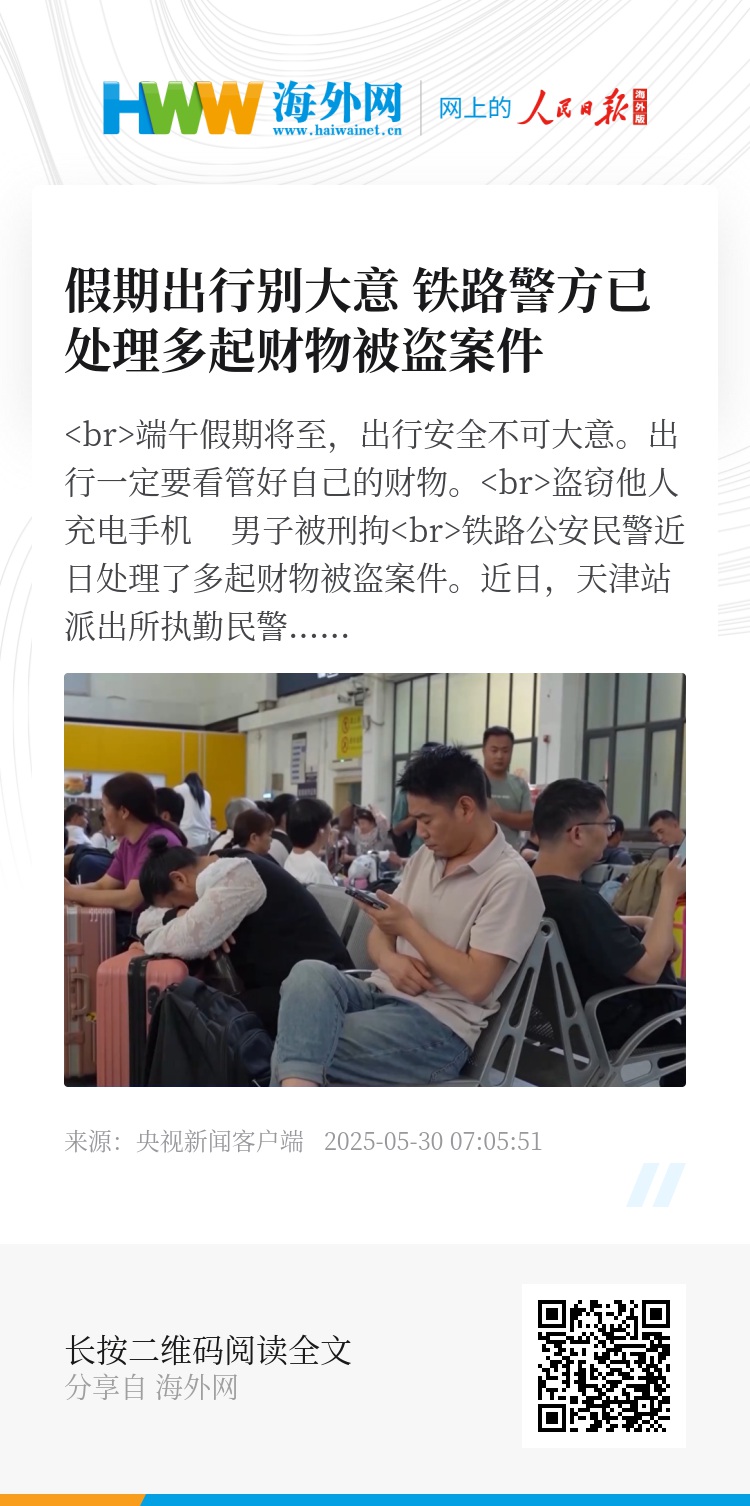 端午假期将至,出行安全不可大意。出行一定要看管好自己的财物。