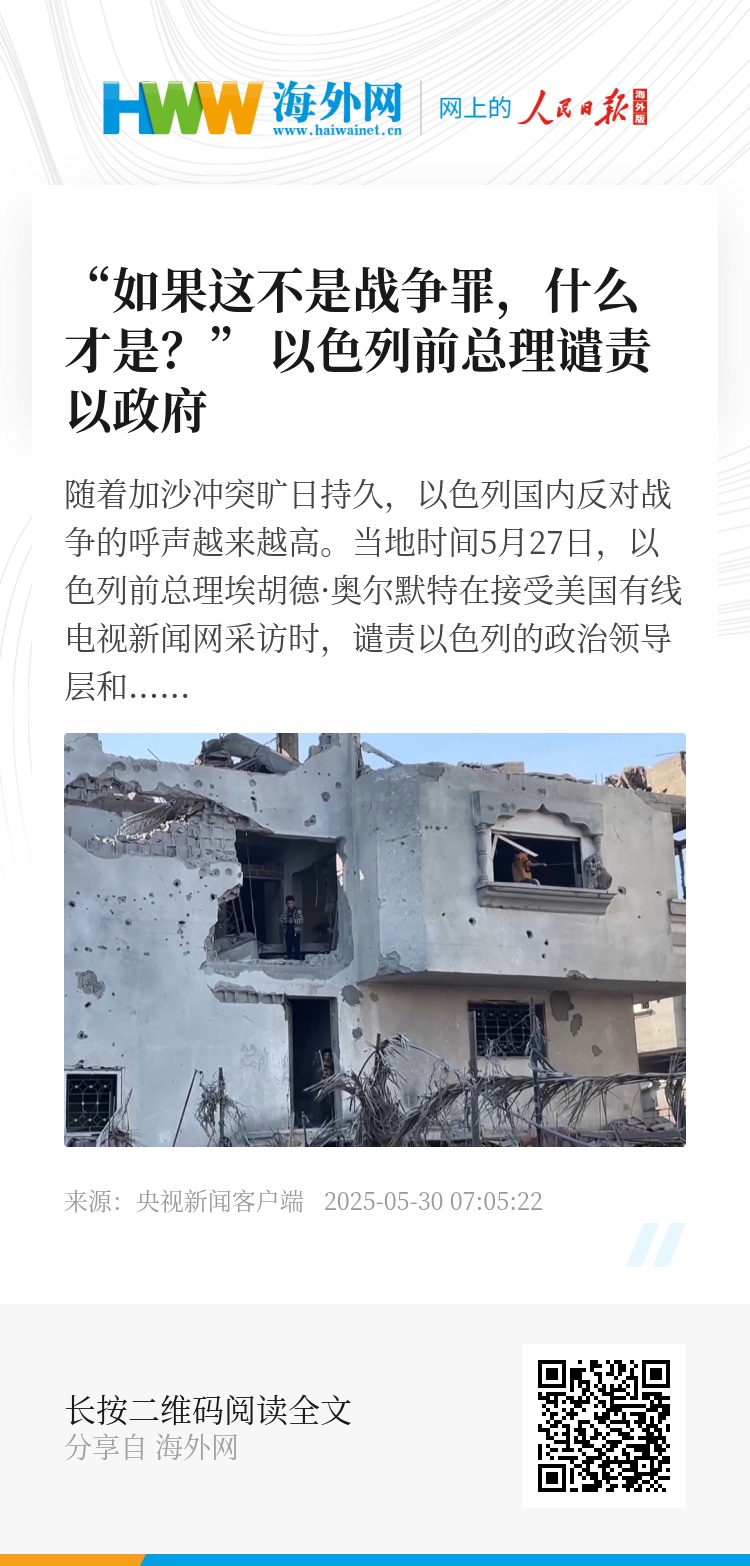 随着加沙冲突旷日持久,以色列国内反对战争的呼声越来越高。当地时间5月27日,以色列前总理埃胡德·奥尔默特在接受美国有线电视新闻网采访时,谴责以色列的政治领导层和军队的行为。他直言,以色列政府犯下的是“战争罪”。