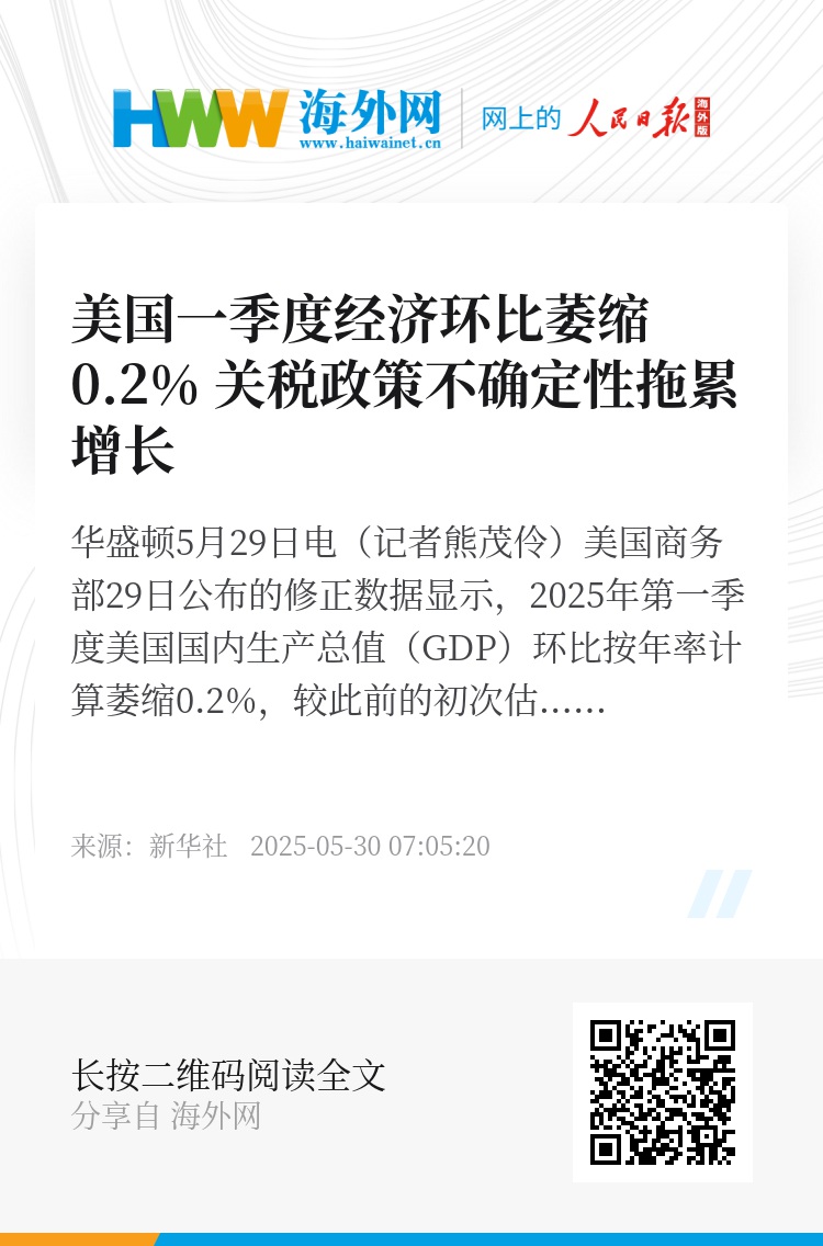新华社华盛顿5月29日电(记者熊茂伶)美国商务部29日公布的修正数据显示,2025年第一季度美国国内生产总值(GDP)环比按年率计算萎缩0.2%,较此前的初次估值上调0.1个百分点。
