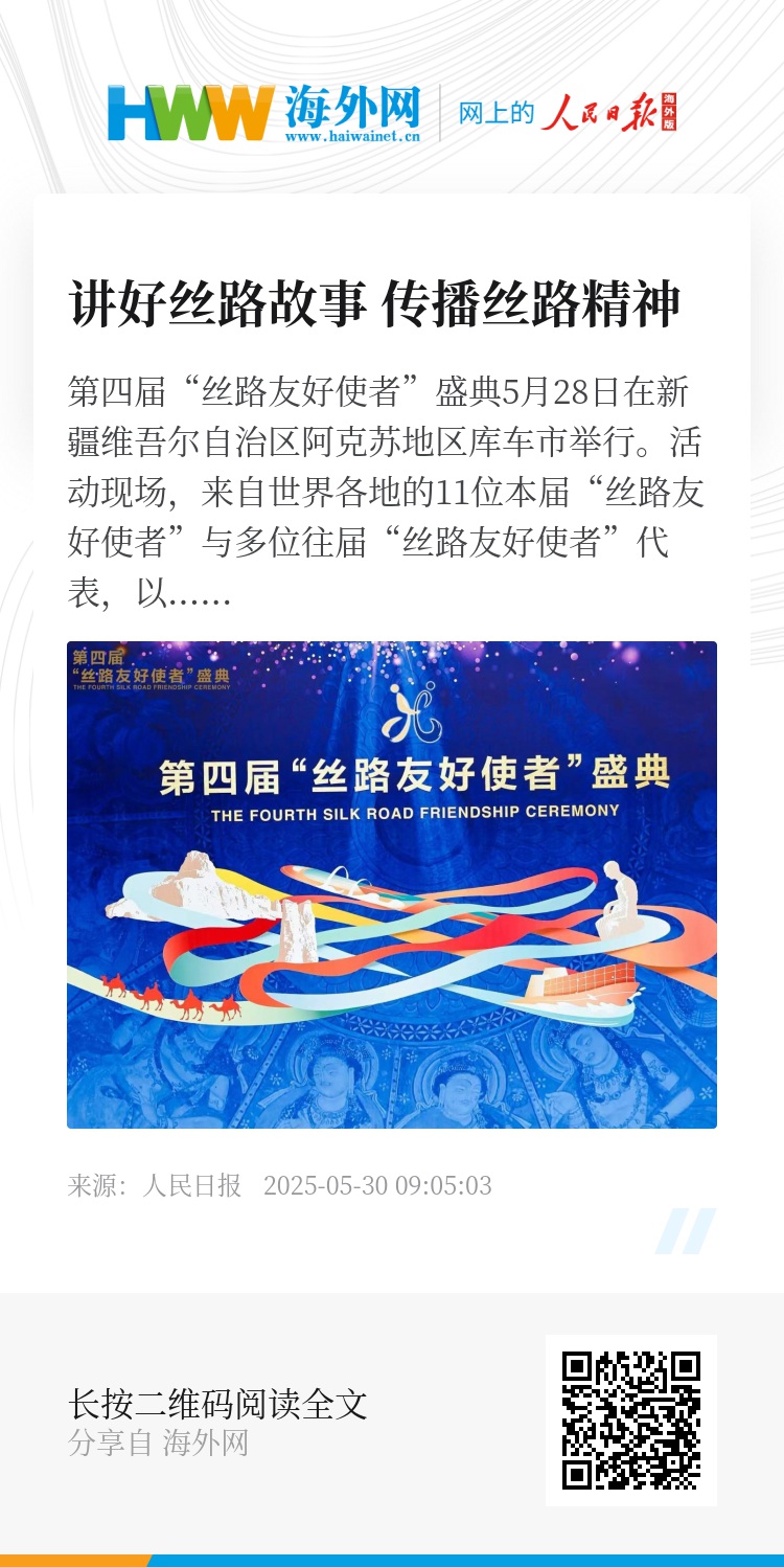 第四届“丝路友好使者”盛典5月28日在新疆维吾尔自治区阿克苏地区库车市举行。活动现场,来自世界各地的11位本届“丝路友好使者”与多位往届“丝路友好使者”代表,以及关心共建“一带一路”的友好人士,真情讲述在项目建设、文化交流等方面的感人故事。